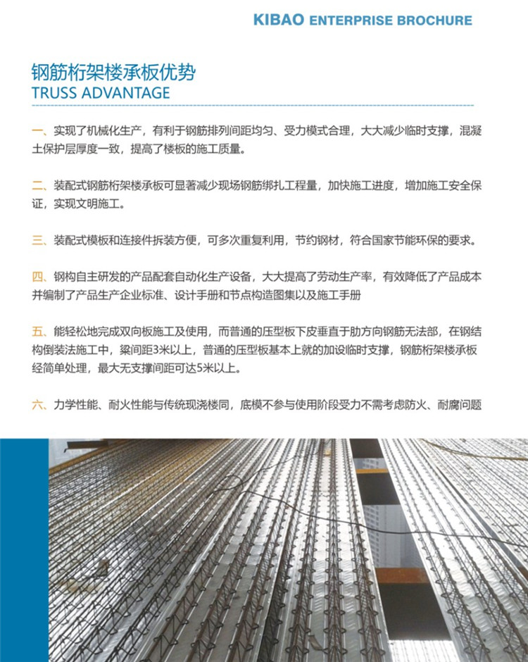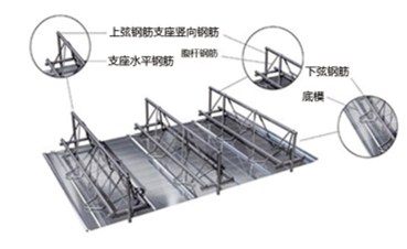 鋼筋桁架樓承板是在壓型樓承板的基礎(chǔ)上改進(jìn)而來(lái)的裝配式模板,是將樓板中的鋼筋在工廠加工成鋼筋桁架,并將鋼筋桁架與鍍鋅壓型鋼板焊接成一體的組合模板,施工階段,鋼筋桁架樓承板可承受施工荷載,直接裝配鋪設(shè)到粱上,進(jìn)行簡(jiǎn)單的鋼筋及栓釘焊接,便可澆筑混凝土,作為第三代樓承板實(shí)現(xiàn)了機(jī)械化生產(chǎn),有利于鋼筋排列間距均勻、受力模式合理,混凝土保護(hù)層厚度一致,顯著減少現(xiàn)場(chǎng)鋼筋綁扎量,編制了產(chǎn)品生產(chǎn)企業(yè)標(biāo)準(zhǔn),設(shè)計(jì)手冊(cè)和節(jié)點(diǎn)構(gòu)造圖集以及施工手冊(cè), 該通過(guò)浙江大學(xué)土木工程測(cè)試中心檢測(cè),并經(jīng)過(guò)多項(xiàng)工程應(yīng)用,各項(xiàng)性能可以滿足現(xiàn)澆鋼筋混凝土樓板承載力和變形的要求。
