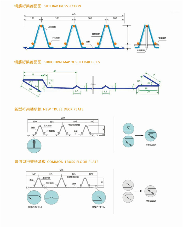 并將鋼筋桁架與鍍鋅壓型鋼板焊接成一體的組合模板,施工階段,鋼筋桁架樓承板可承受施工荷載,直接裝配