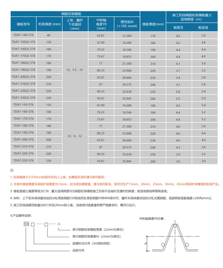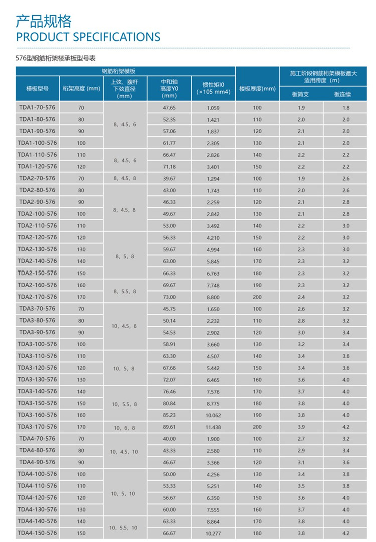 鋼筋桁架樓承板分為600型和576型模板型號(hào)(模板寬度mm為單位),以施工階段要 求及標(biāo)準(zhǔn)定制規(guī)格,部分產(chǎn)品規(guī)格選用表如下: